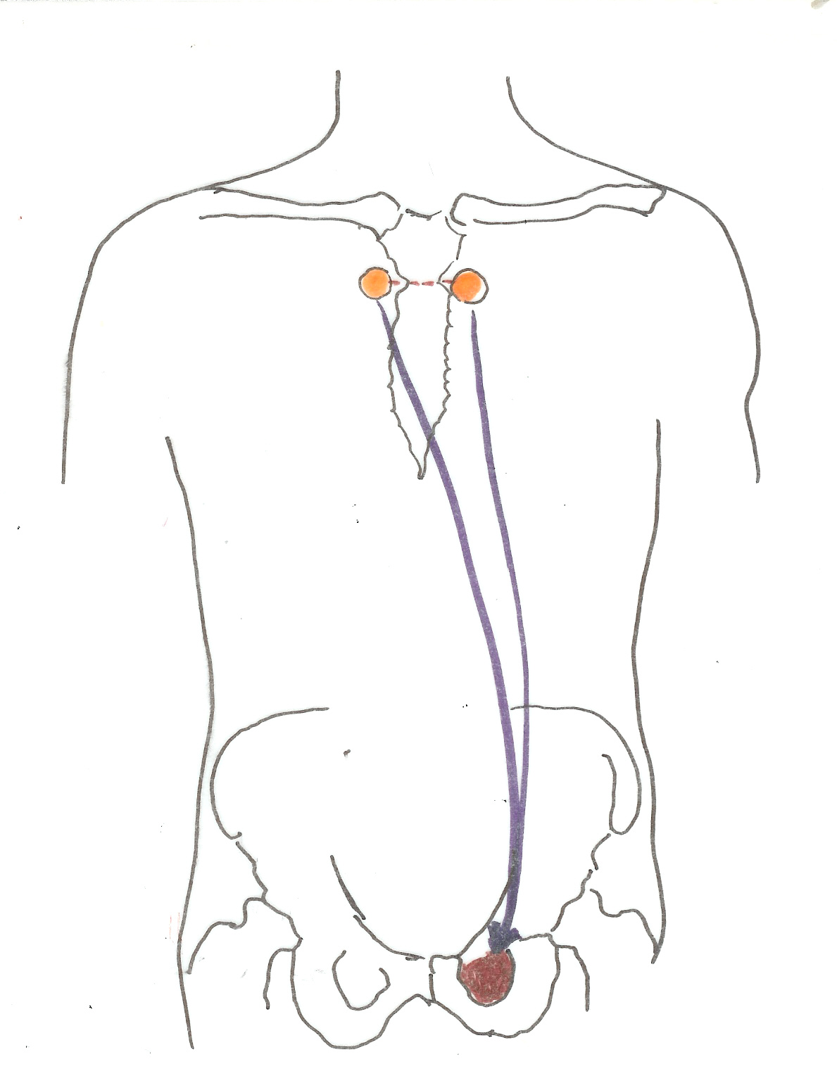 Place hand, tumb-side touching body, with pinkie up in the air -- perpendicular to body. (The reflexes are 1-inch spheres that are taking up the space from 2 - 3 inches off the body on either side of the angle of Luis). Aim from there to the right obturator foramen. Place other hand on hyperpermeable site, the reflex for it if you know it, or imagin hand over entire body.